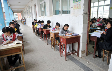 Two rows of students, considered naughty or not performing well academically, sit an exam outside a classroom at a middle school in Jinxian county, East China's Jiangxi province, Nov 8, 2011. The temperature dropped by a dozen degrees and many students were shivering in the cold.